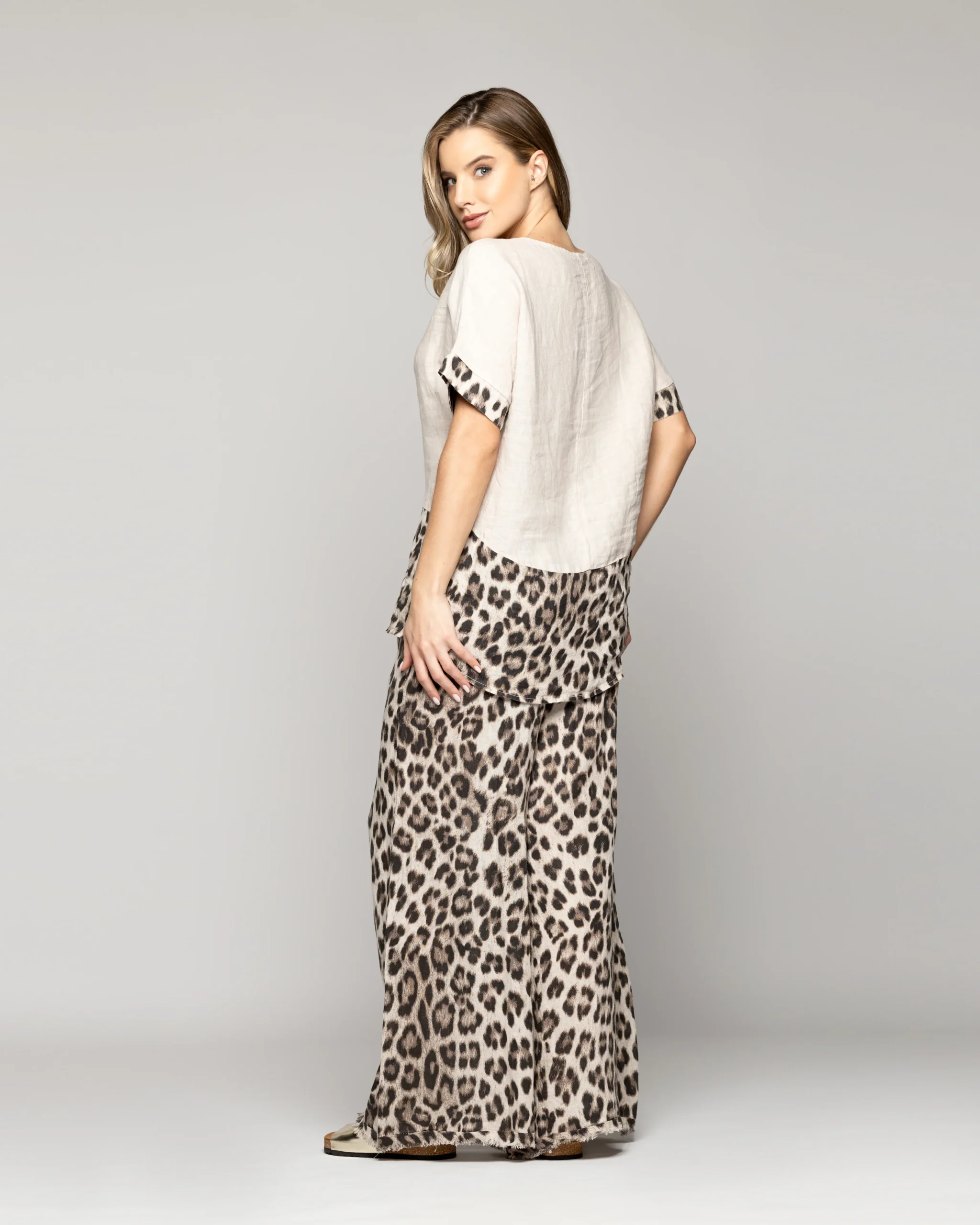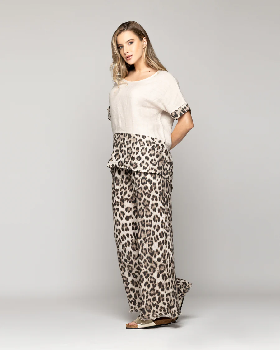 Blusa Bettina Lineatre está confeccionada en 100% lino, una fibra natural reconocida por su frescura, resistencia y textura única. Su acabado liviano y transpirable la hace ideal para climas cálidos, mientras que su caída elegante y aspecto ligeramente rústico le otorgan un estilo atemporal y sofisticado. Perfecta para quienes valoran la comodidad y la naturalidad en sus prendas. Es de manga corta, cuello redondo y con un detalle de animal print. Ideal para combinar con el pantalón a juego o con prendas neutras (blanco, negro, denim). Los detalles en animal print la hacen perfecta para un look con personalidad sin perder la comodidad. Agrega accesorios simples para mantener el protagonismo de la prenda.